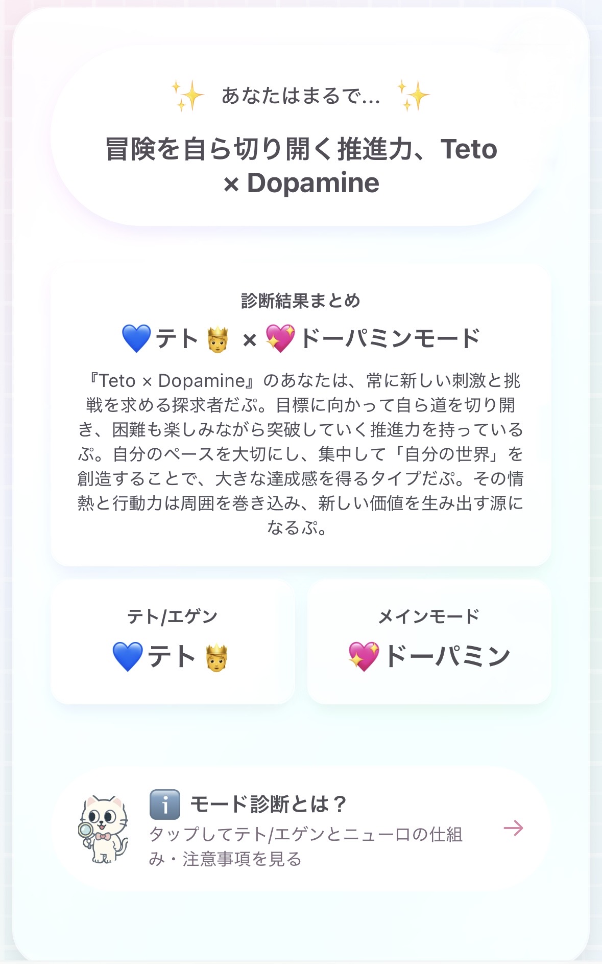 テト/エゲンの考え方をベースに、にゃAIでは会話ログから「いまのモード」を推定し、さらにニューロ4軸(ドーパミン/セロトニン/オキシトシン/アセチルコリン)を加えた複合分析を行います。Tetoは率先・挑戦・推進力、Egenは共感・調整・洞察に寄りやすい心理状態を指し、優劣ではなく場面によるスイッチが前提です。